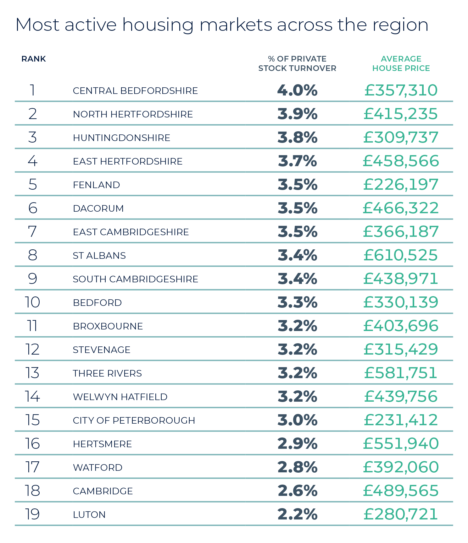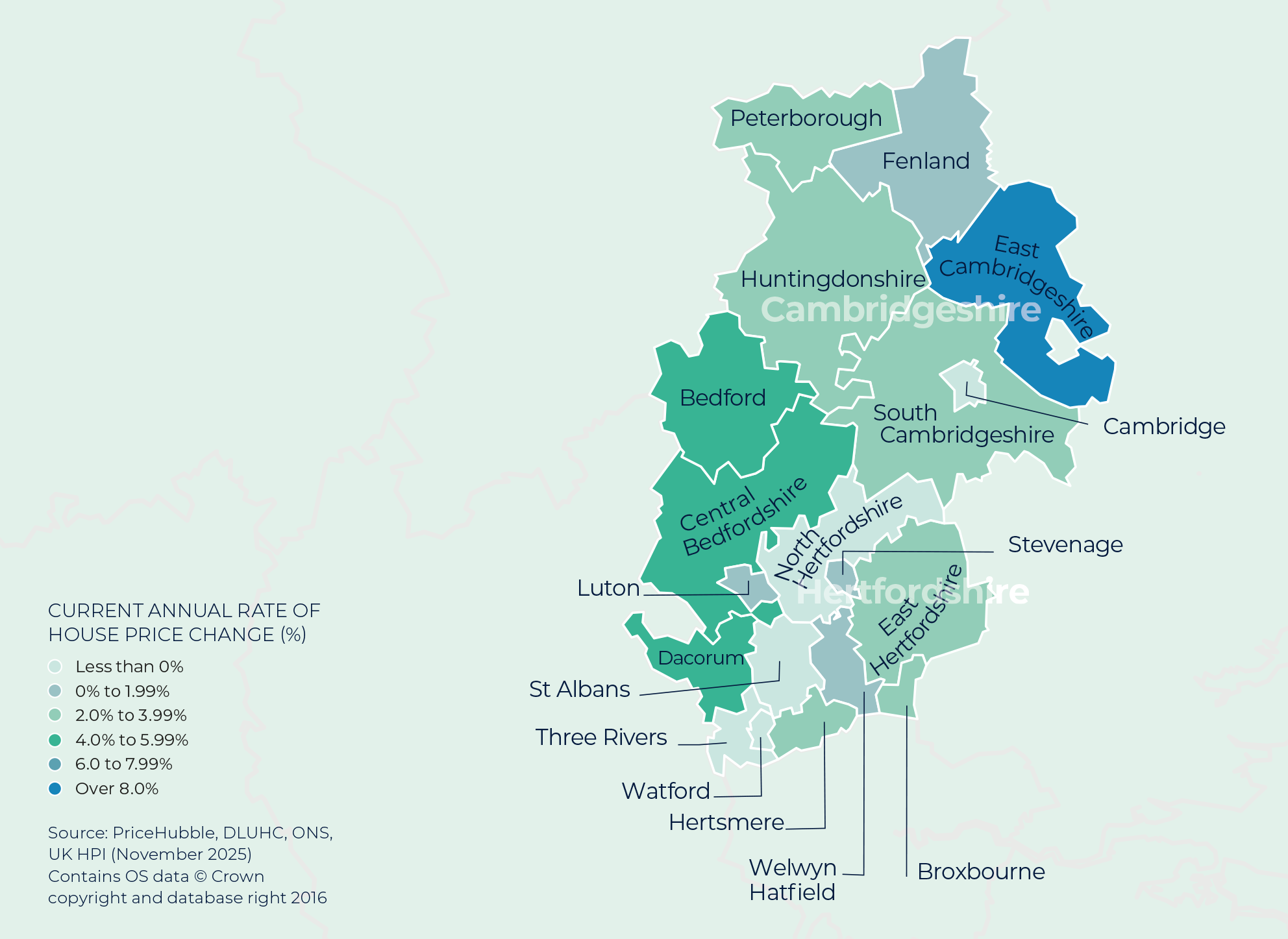 2026 began with the highest level of homes for sale in over eight years, with the average agent marketing 32 properties (Zoopla). Around a third of these homes were previously listed in 2025 and have since returned to the market after uncertainty late last year dampened activity. The uplift in supply is most pronounced in southern England, where listings in London were up 16% year on year and the South East saw a 9% increase. House price growth remains linked to supply, with increased availability moderating growth by giving buyers more choice and greater negotiating power. As always, local pricing can differ significantly from national trends. Average property values in the region grew by 1.8% on last year’s levels. Strongest price growth was evident in East Cambridgeshire (12.5%), a margin ahead of the next top performers Bedford (5.3%) and Dacorum (4.8%).
