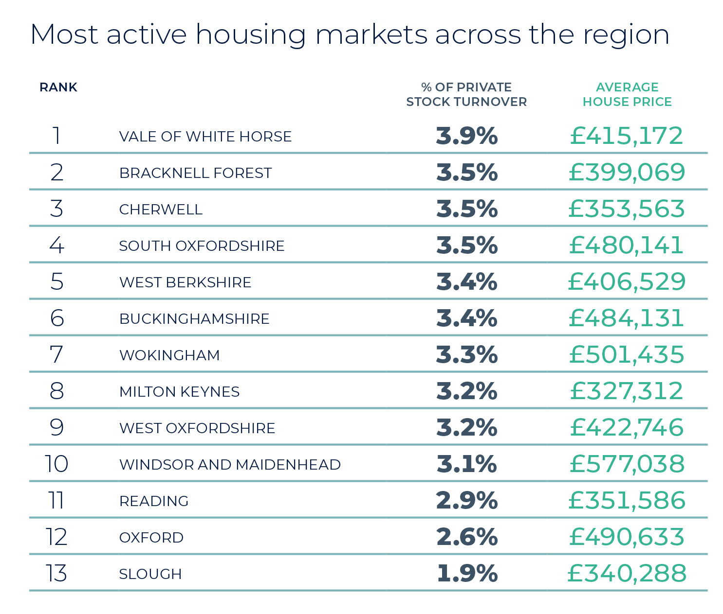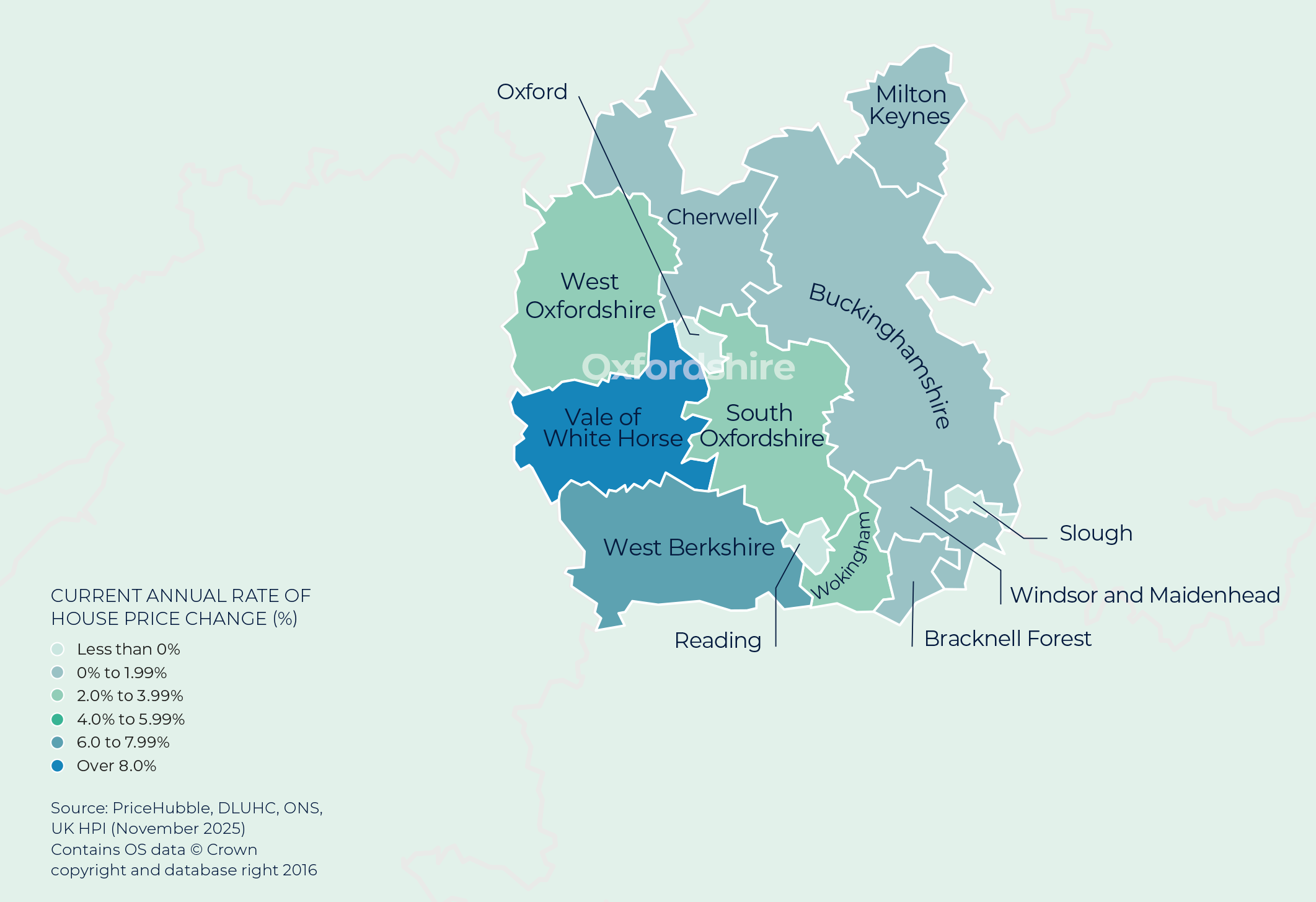2026 began with the highest level of homes for sale in over eight years, with the average agent marketing 32 properties (Zoopla). Around a third of these homes were previously listed in 2025 and have since returned to the market after uncertainty late last year dampened activity. The uplift in supply is most pronounced in southern England, where listings in London were up 16% year on year and the South East saw a 9% increase. House price growth remains linked to supply, with increased availability moderating growth by giving buyers more choice and greater negotiating power. As always, local pricing can differ significantly from national trends. Average property values in the region were up 1% on last year’s levels. Strongest price growth was evident in the Vale of White Horse (9.2%), a margin ahead of the next top performers West Berkshire (6.0%) and South Oxfordshire (3.3%).