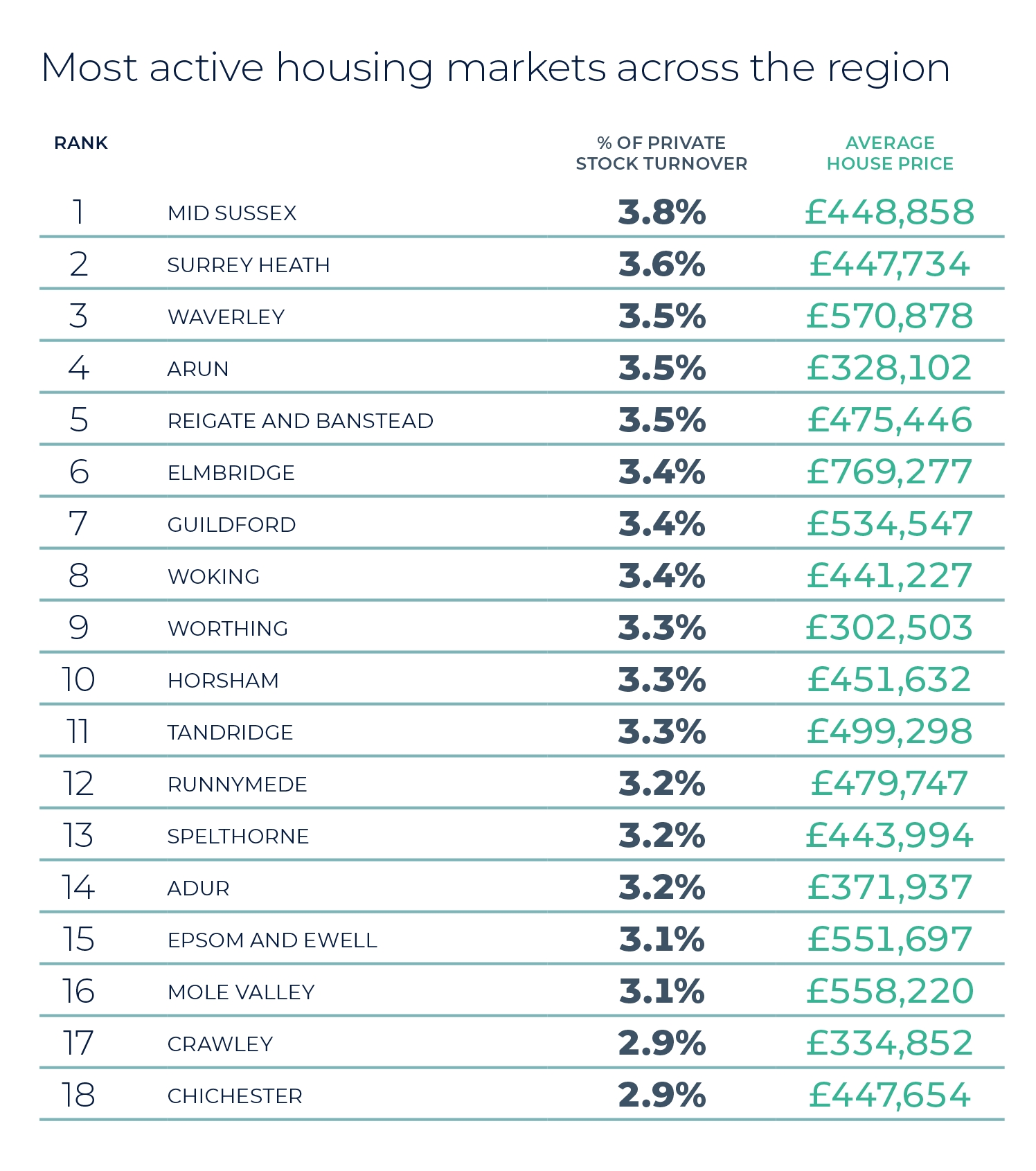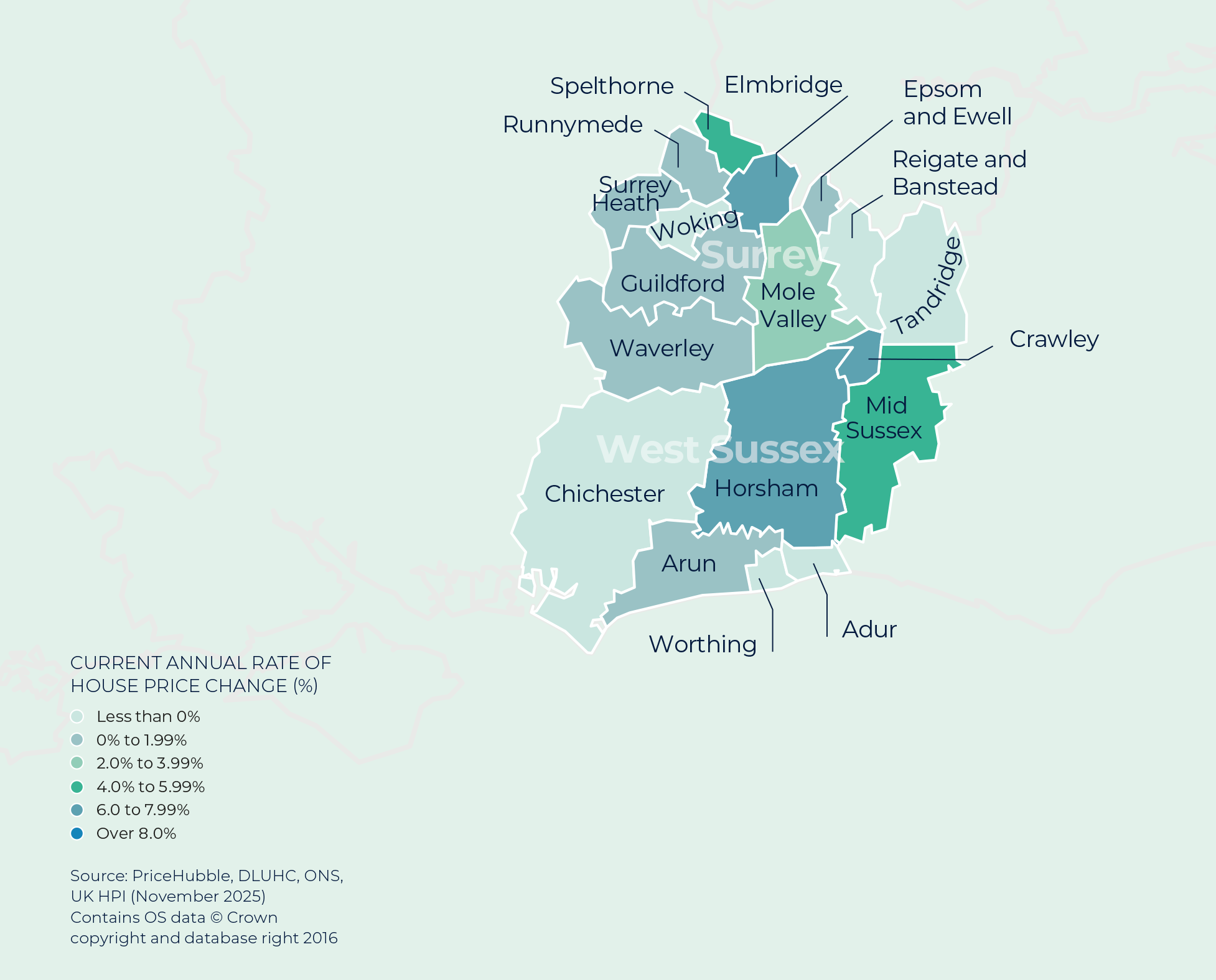 2026 began with the highest level of homes for sale in over eight years, with the average agent marketing 32 properties (Zoopla). Around a third of these homes were previously listed in 2025 and have since returned to the market after uncertainty late last year dampened activity. The uplift in supply is most pronounced in southern England, where listings in London were up 16% year on year and the South East saw a 9% increase. House price growth remains linked to supply, with increased availability moderating growth by giving buyers more choice and greater negotiating power. As always, local pricing can differ significantly from national trends. Average property values in the region were up 1% on last year’s levels. Strongest price growth was evident in Crawley, Horsham and Elmbridge, all growing by more than 6%.