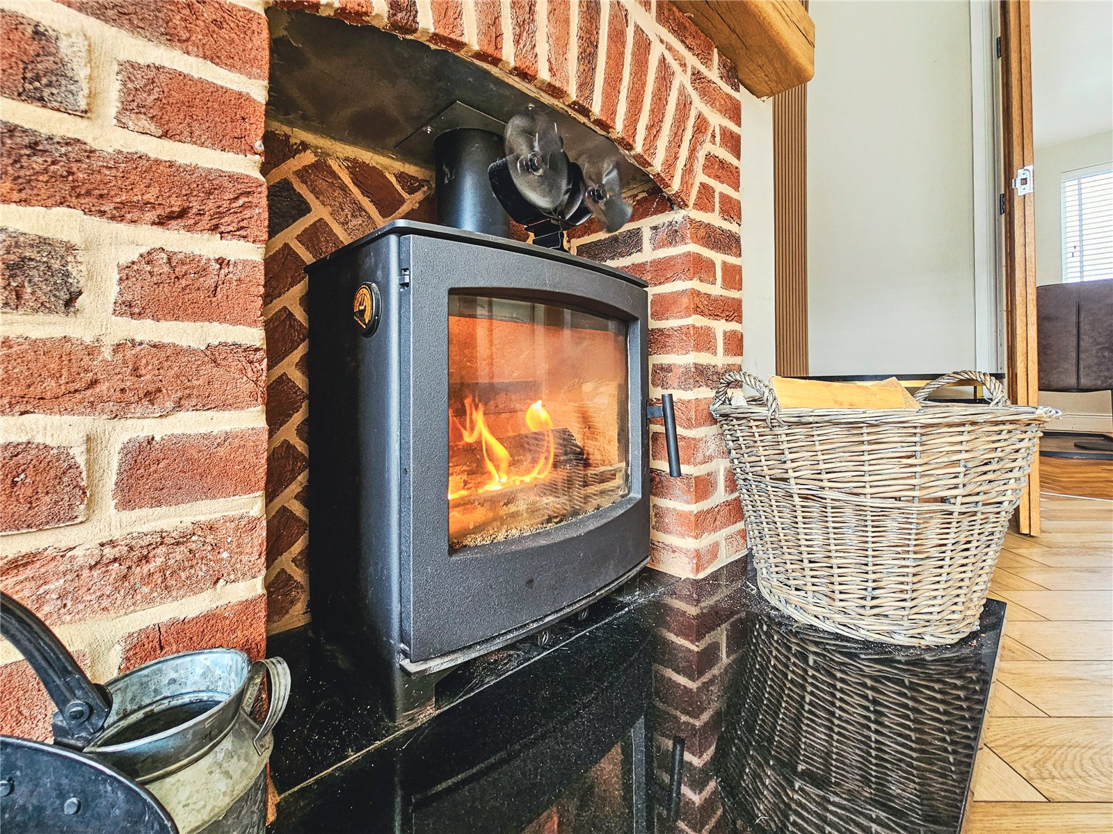 The comfortable lounge provides a cosy retreat, enhanced by a charming log-burning stove, perfect for relaxing evenings.