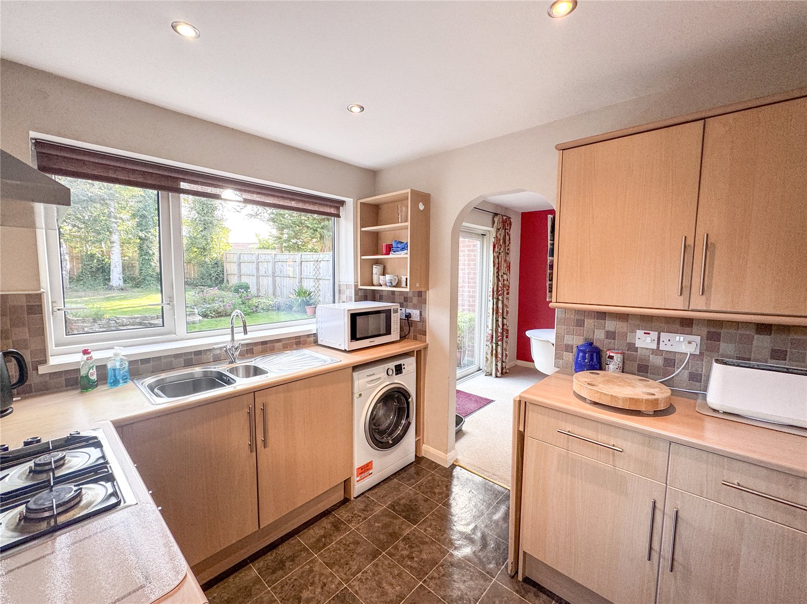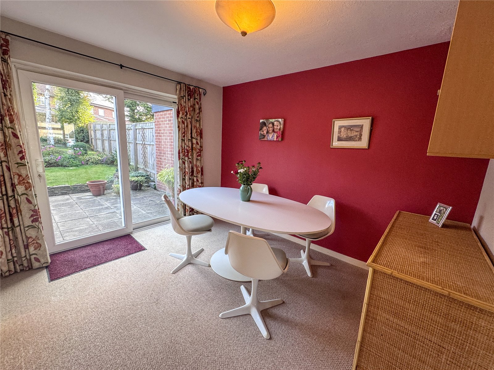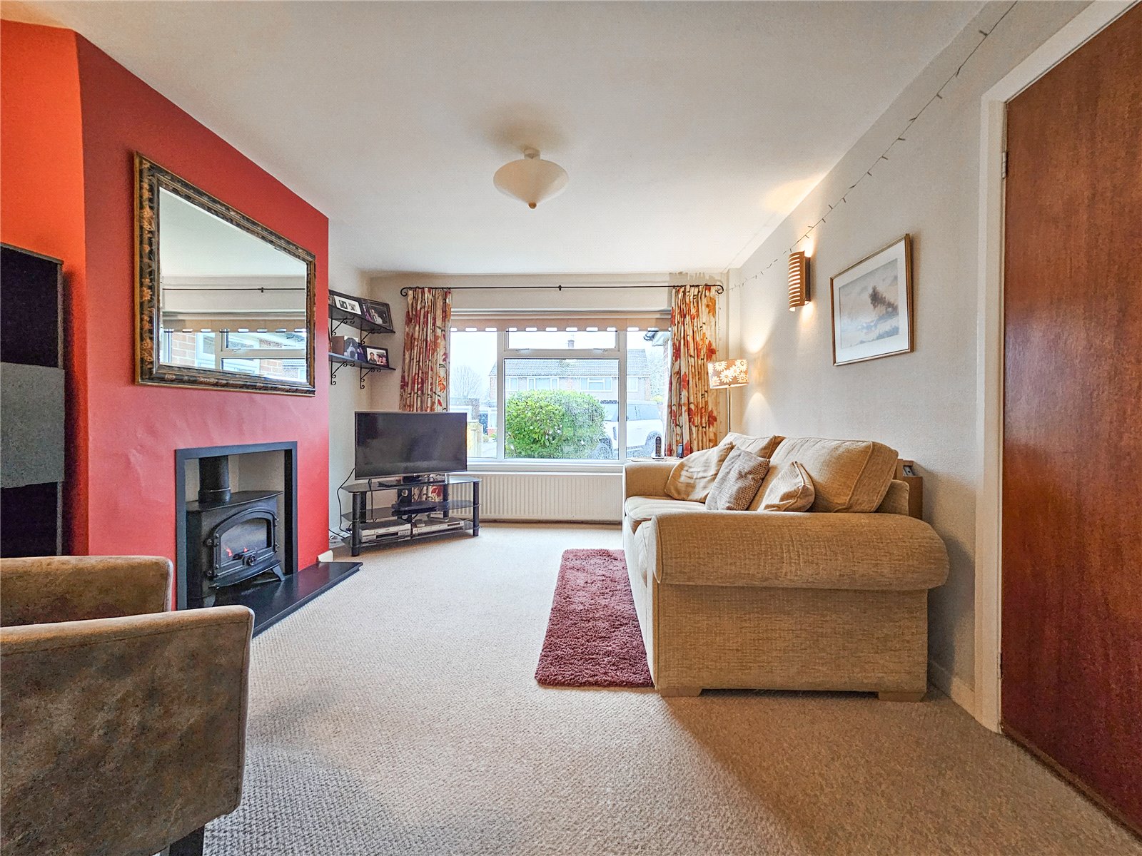 The front door opens to a welcoming vestibule, with storage and access to an inner hallway and the convenient ground floor WC. A light and airy living room is centred around a charming feature log-burning stove, creating a cosy focal point. A separate dining room enjoys direct access to the rear garden via patio doors, offering an ideal setting for both everyday dining and entertaining. and opens to a fitted kitchen.