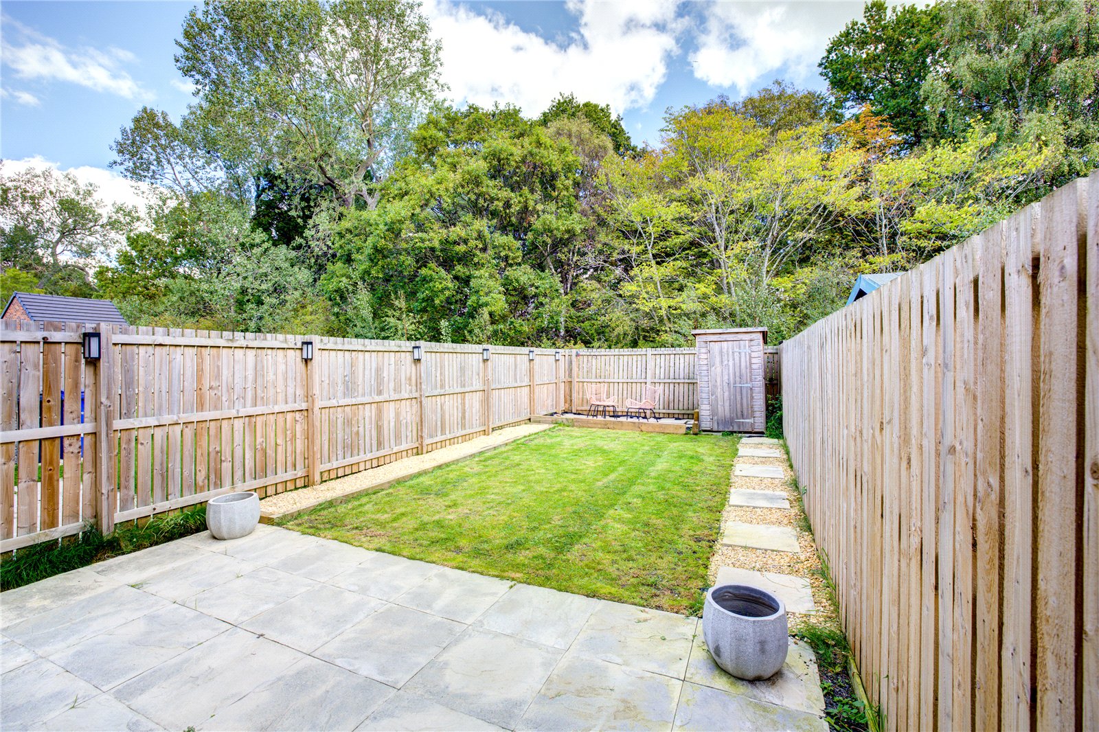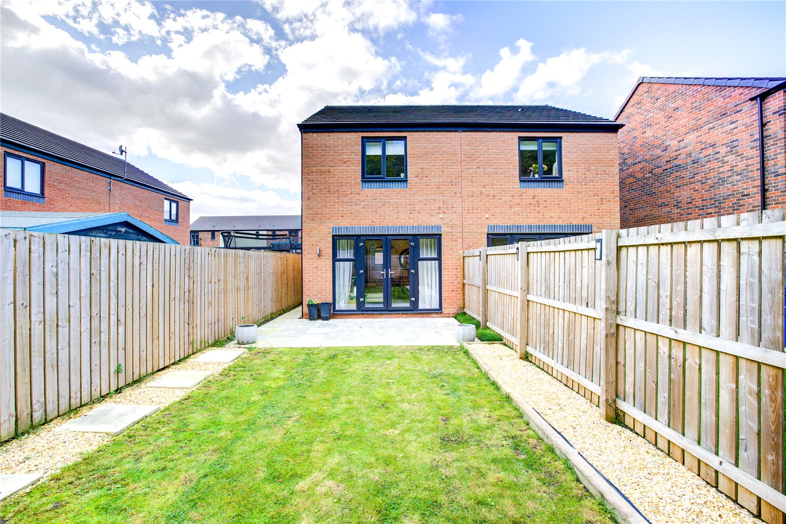 To the front, a driveway provides private off-street parking. The rear garden offers a secure and low-maintenance outdoor space, featuring a lawn and patio, perfect for enjoying summer evenings.