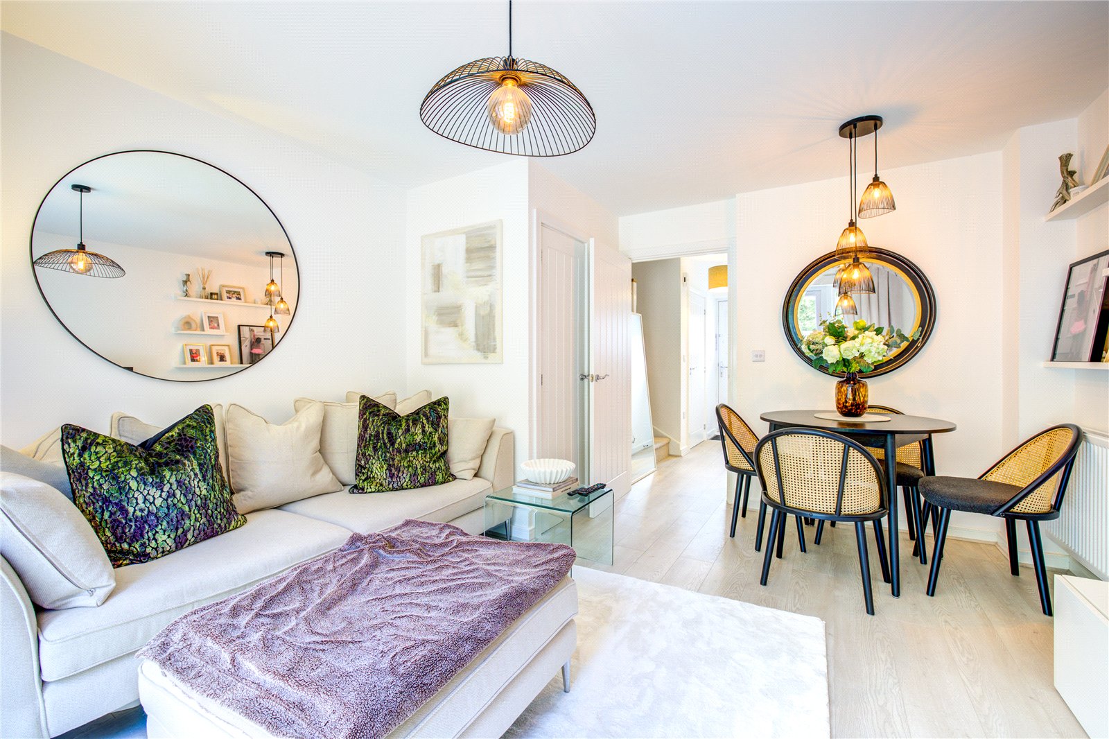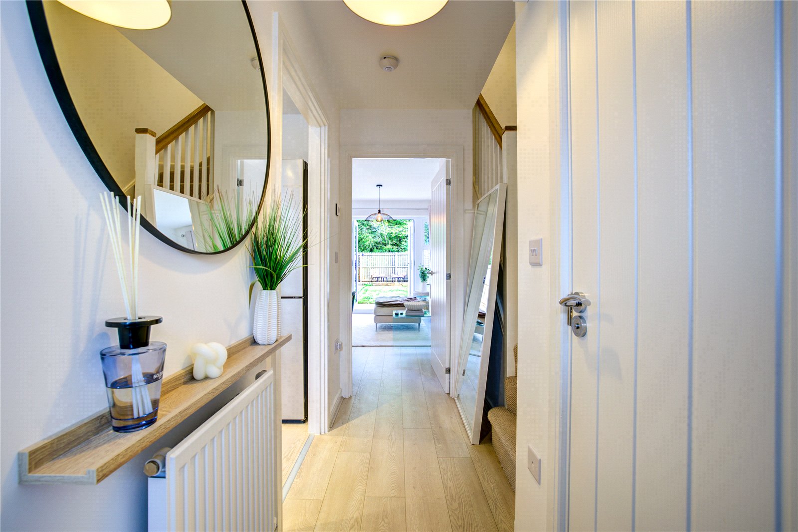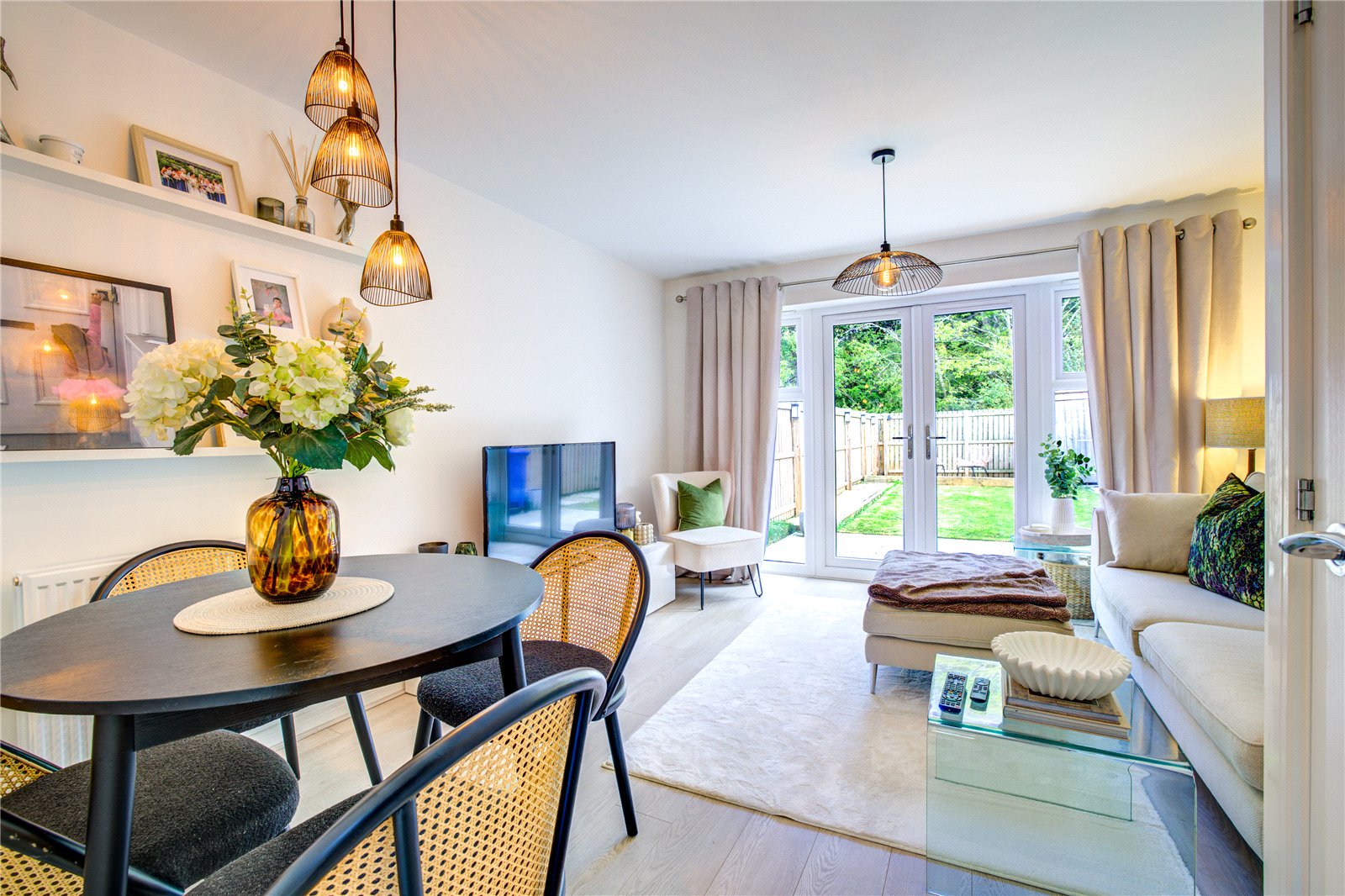 The entrance hallway leads to a modern fitted kitchen, designed with sleek cabinetry, integrated oven and hob, and ample storage space. To the rear sits a light and spacious lounge/diner, with French doors opening directly onto the garden – ideal for both everyday living and entertaining.