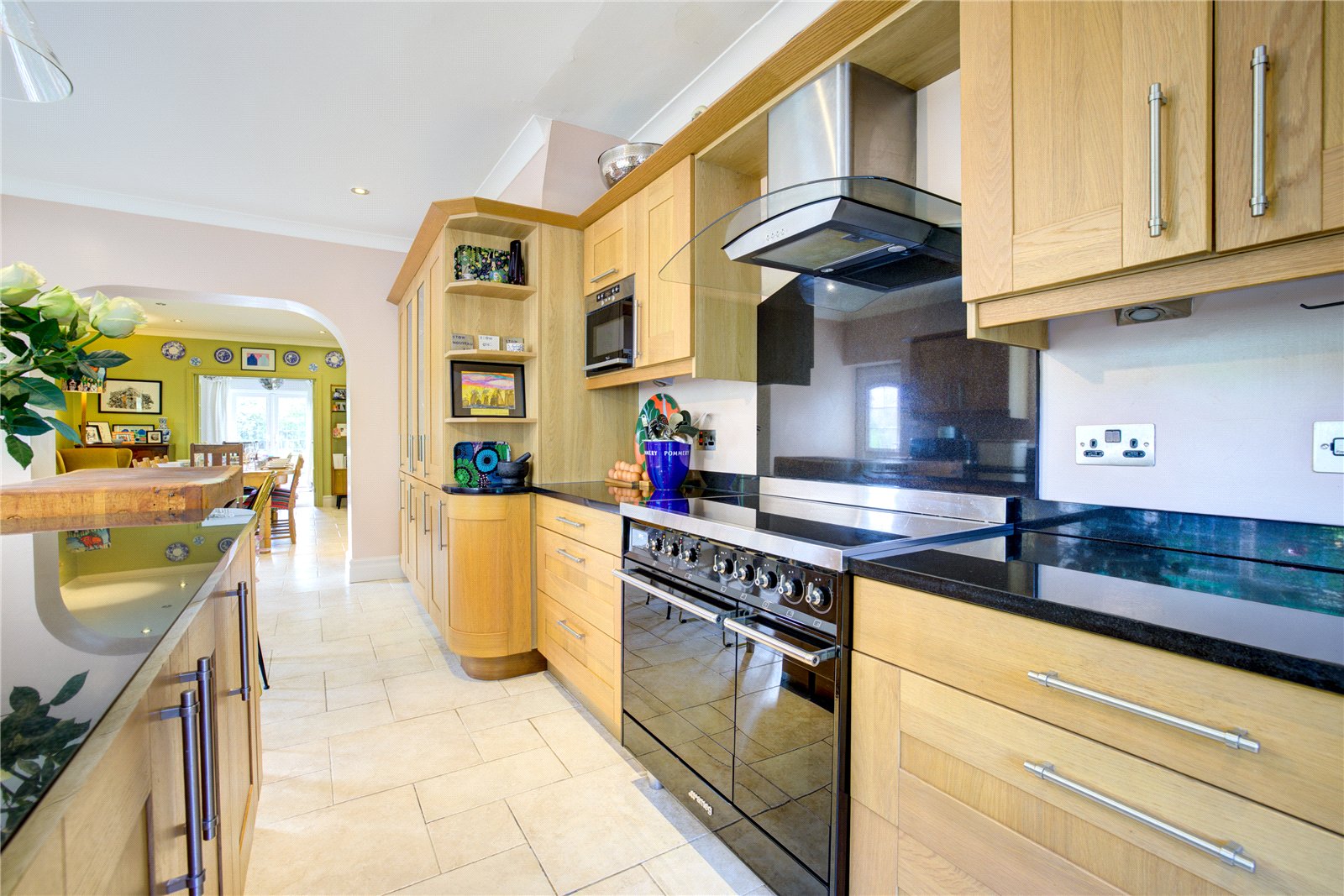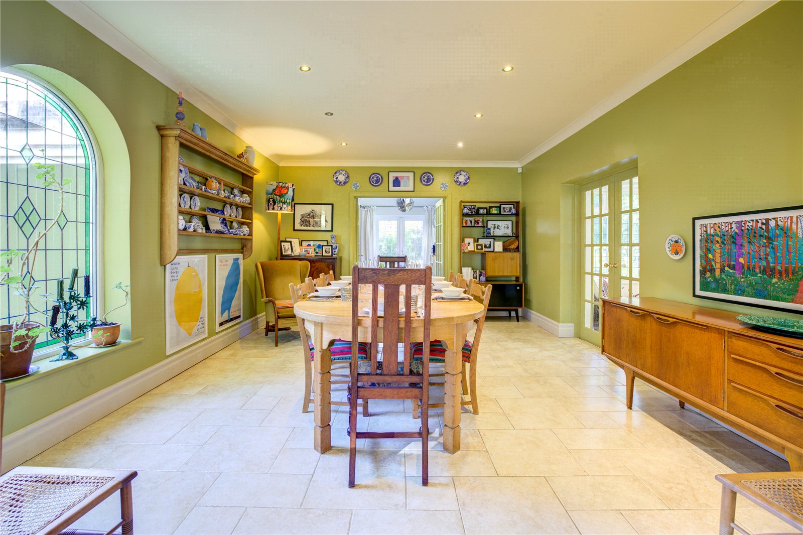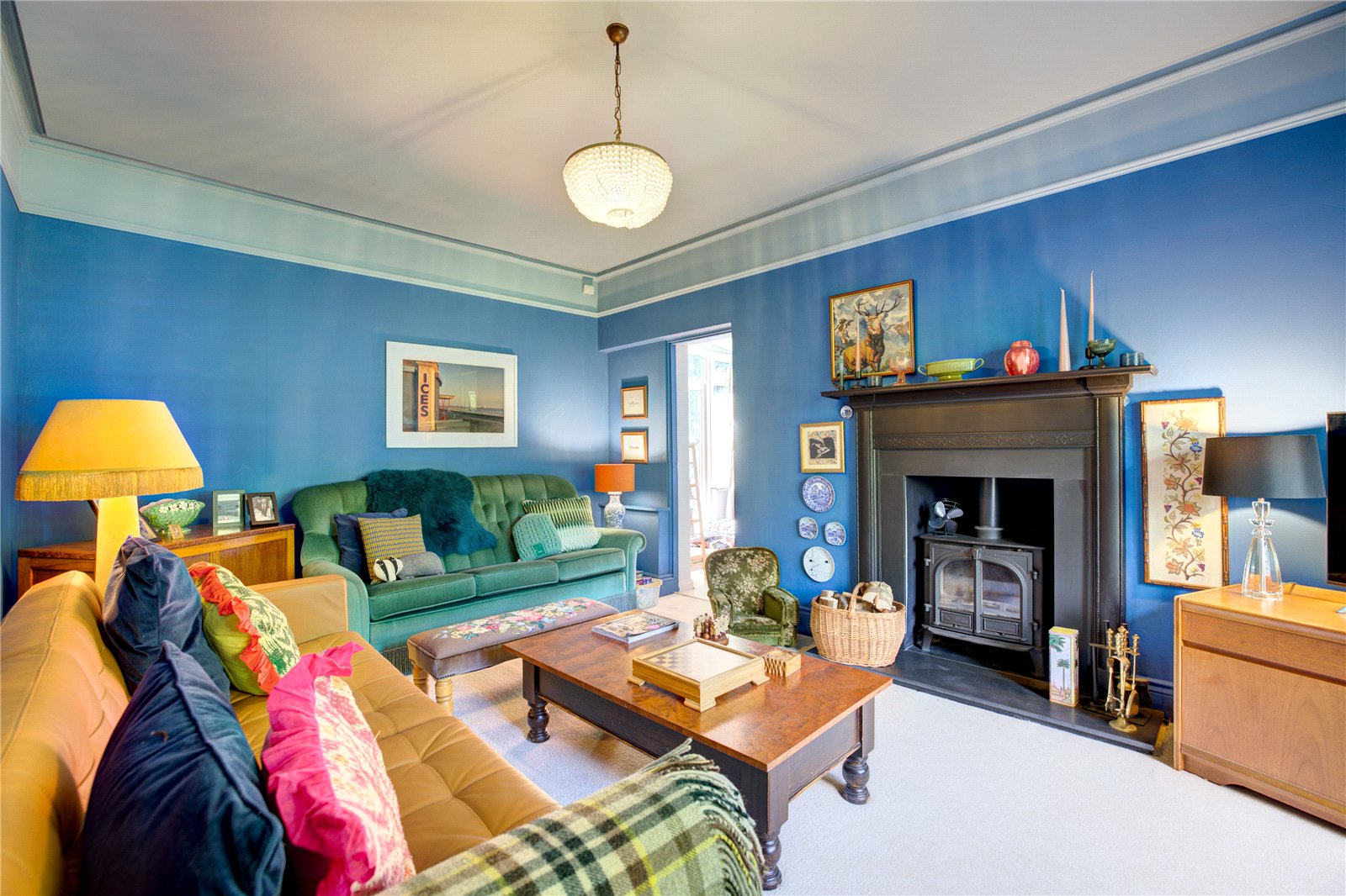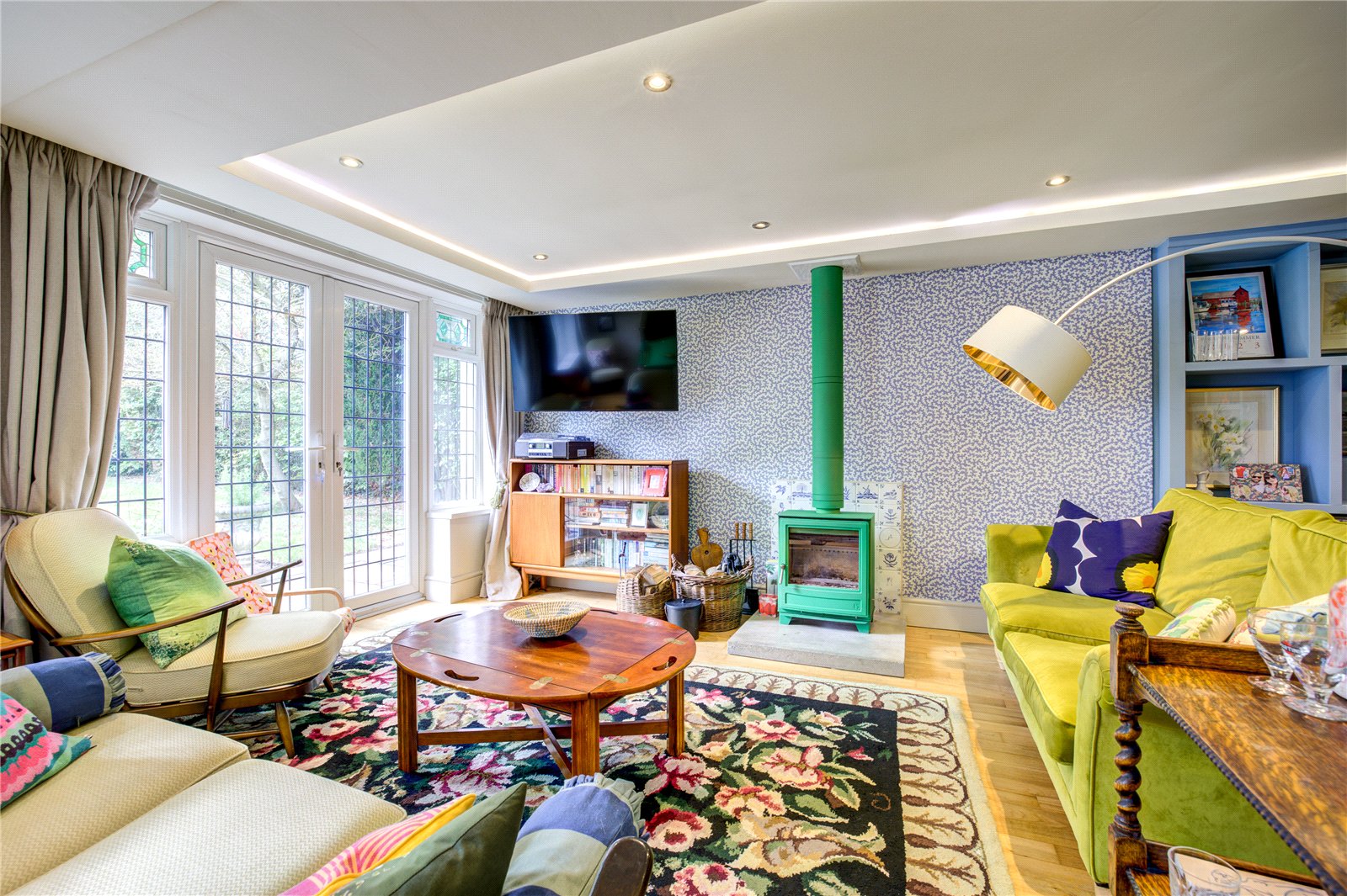 The ground floor offers a wealth of versatile reception spaces, thoughtfully designed for relaxed family life and entertaining. A sitting room with a log-burning stove establishes an atmosphere of refined comfort, ideal for cosy evenings, while the expansive lounge/garden room, featuring a second log-burning stove and bespoke built-in bookcase, is bathed in natural light and opens directly onto the mature gardens that surround the home – perfect for seamless indoor-outdoor living.