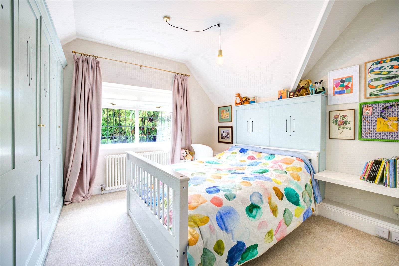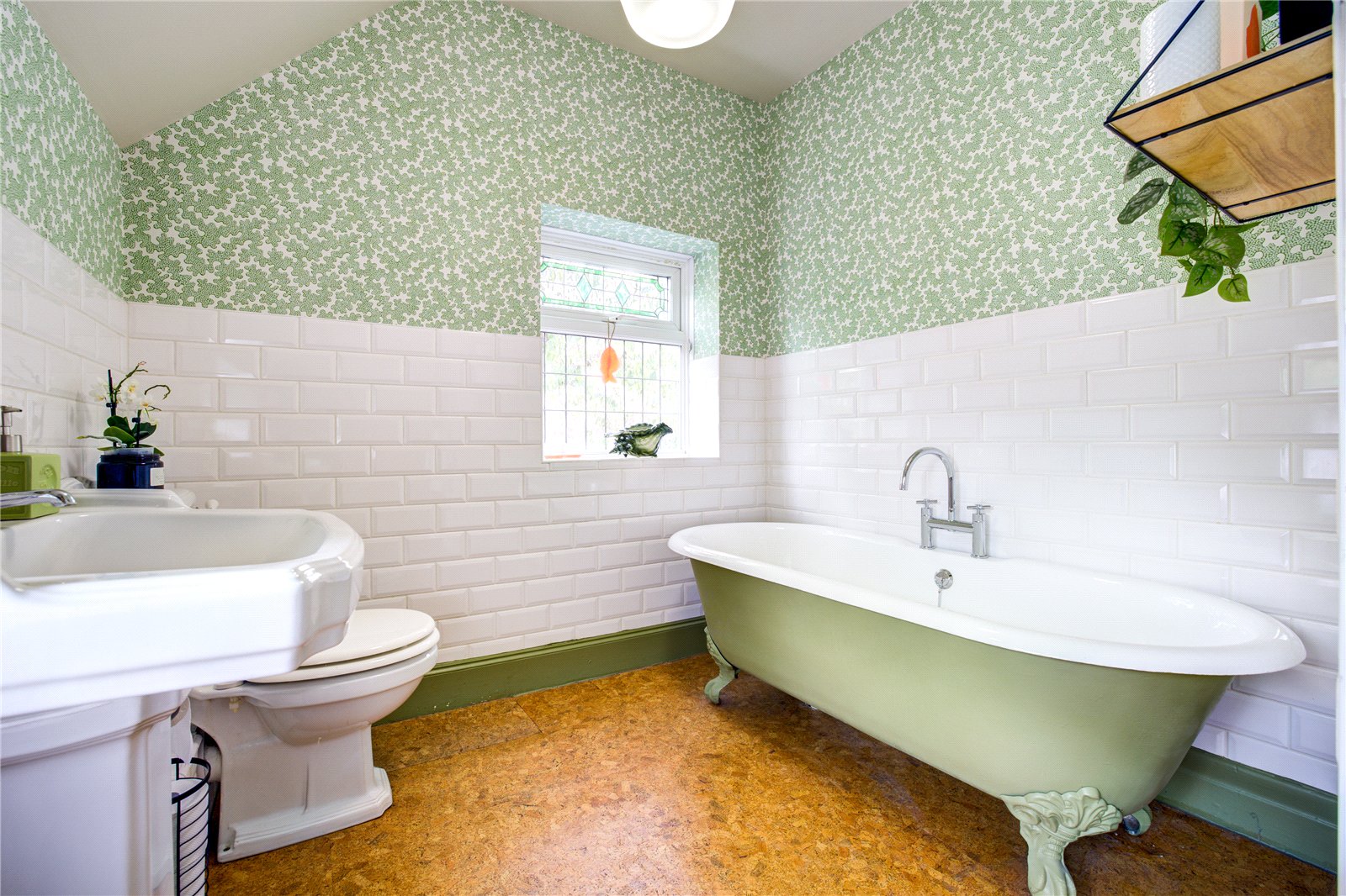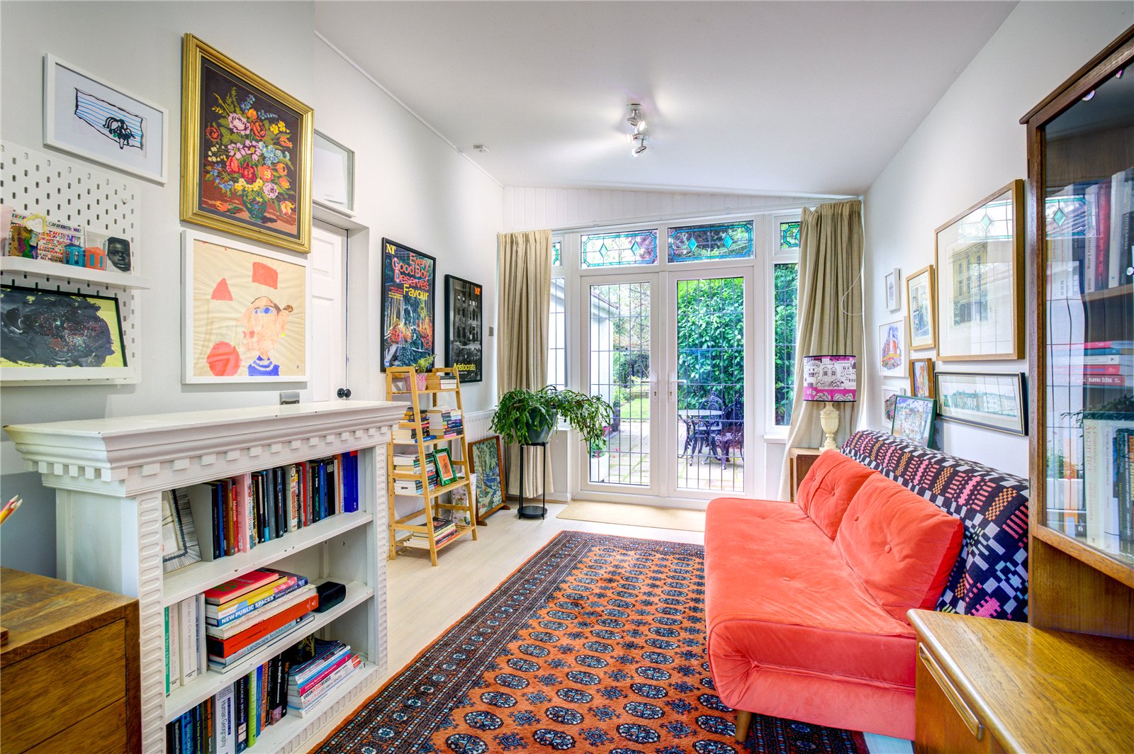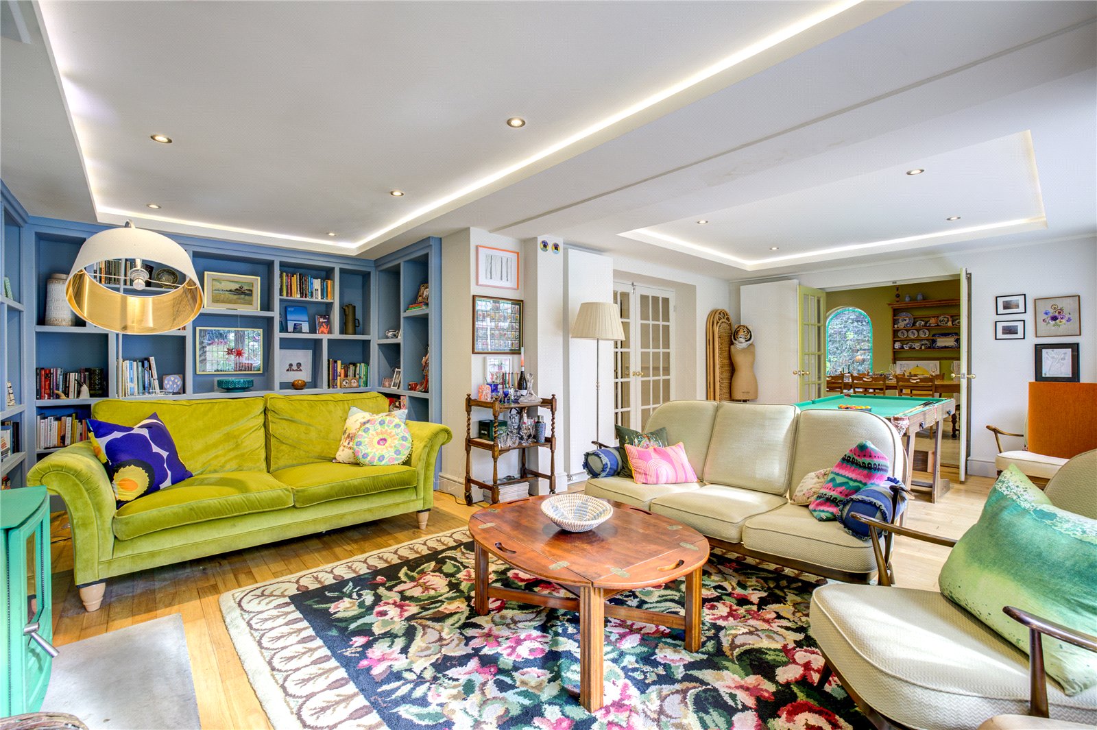 The ground floor offers a wealth of versatile reception spaces, thoughtfully designed for relaxed family life and entertaining. A sitting room with a log-burning stove establishes an atmosphere of refined comfort, ideal for cosy evenings, while the expansive lounge/garden room, featuring a second log-burning stove and bespoke built-in bookcase, is bathed in natural light and opens directly onto the mature gardens that surround the home – perfect for seamless indoor-outdoor living.