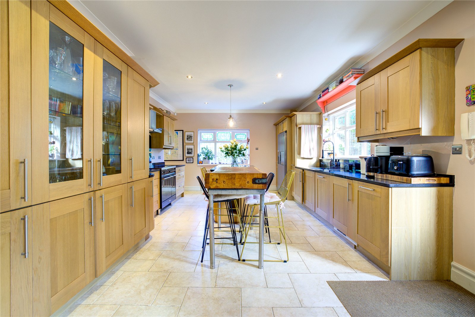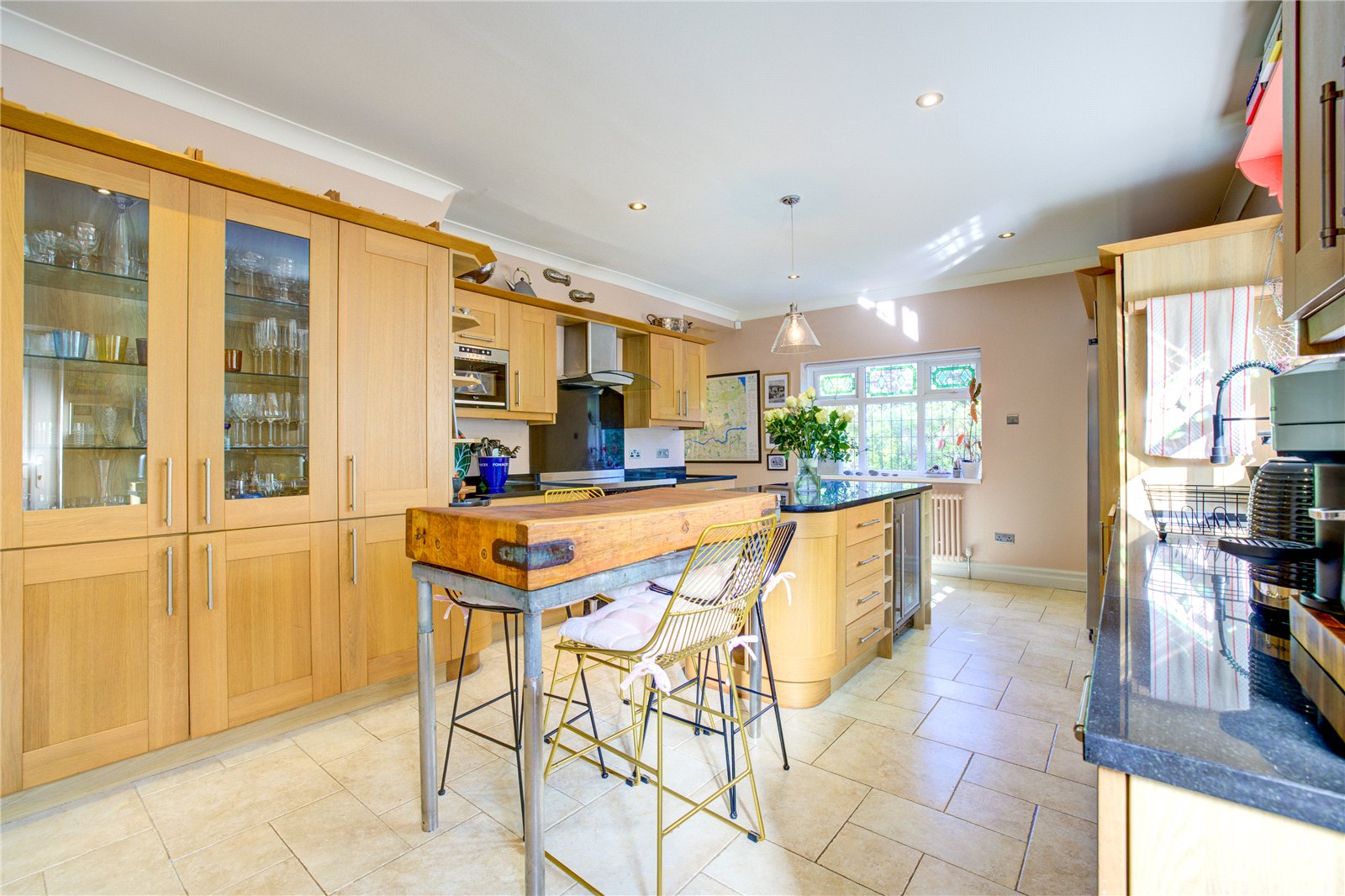 At the heart of the home lies a large bespoke kitchen/diner featuring granite worktops, integrated appliances, and a charming central island—ideal for family breakfasts and entertaining.