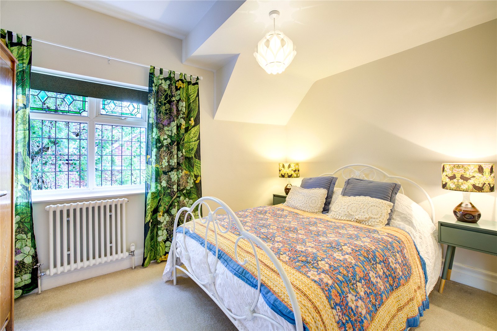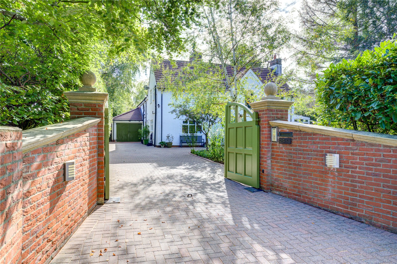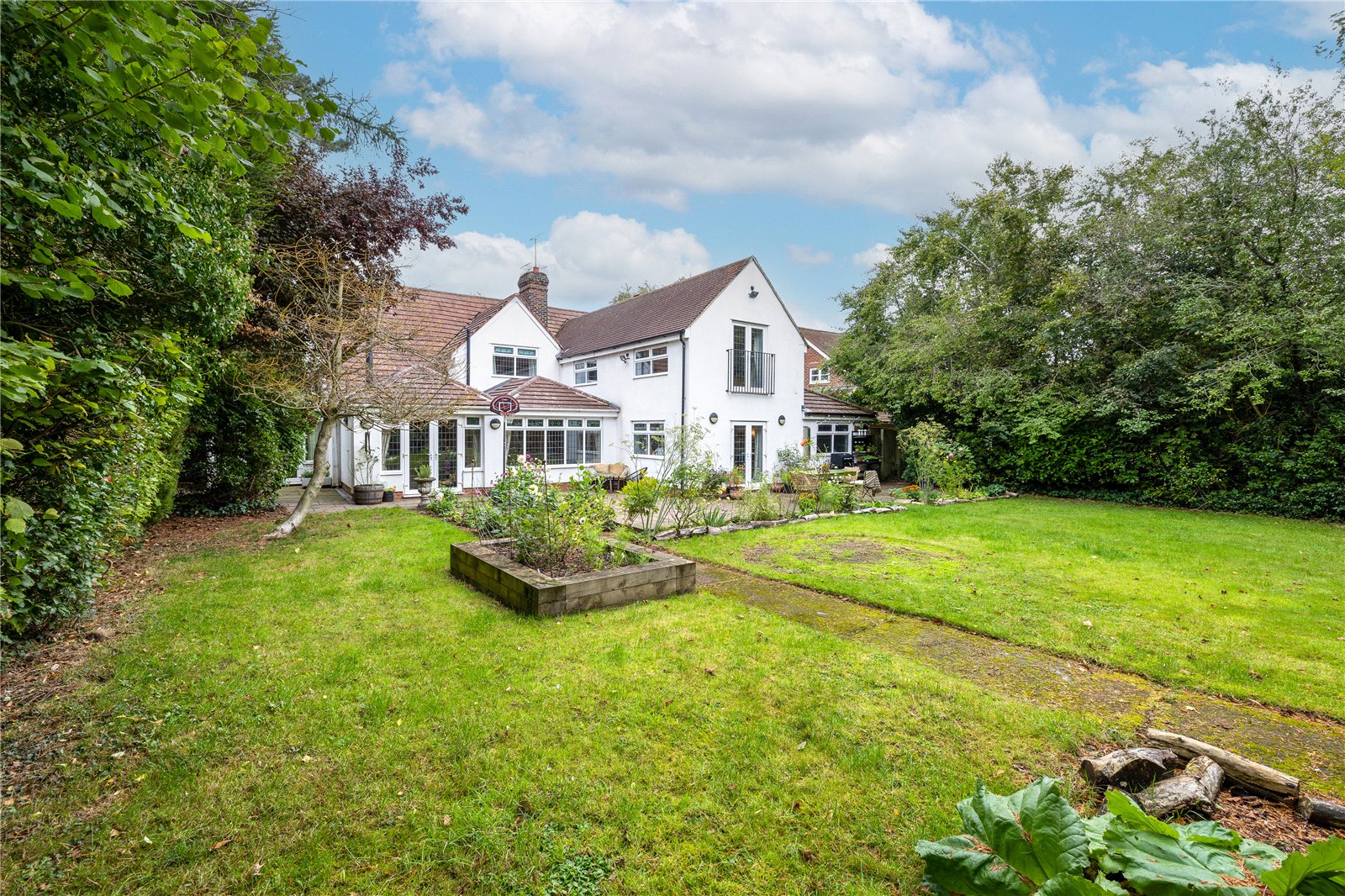 Set behind a generous frontage and framed by mature planting, the property enjoys a private south-facing garden, with expansive lawned areas, mature trees, and established beds, offering both tranquillity and space to entertain.