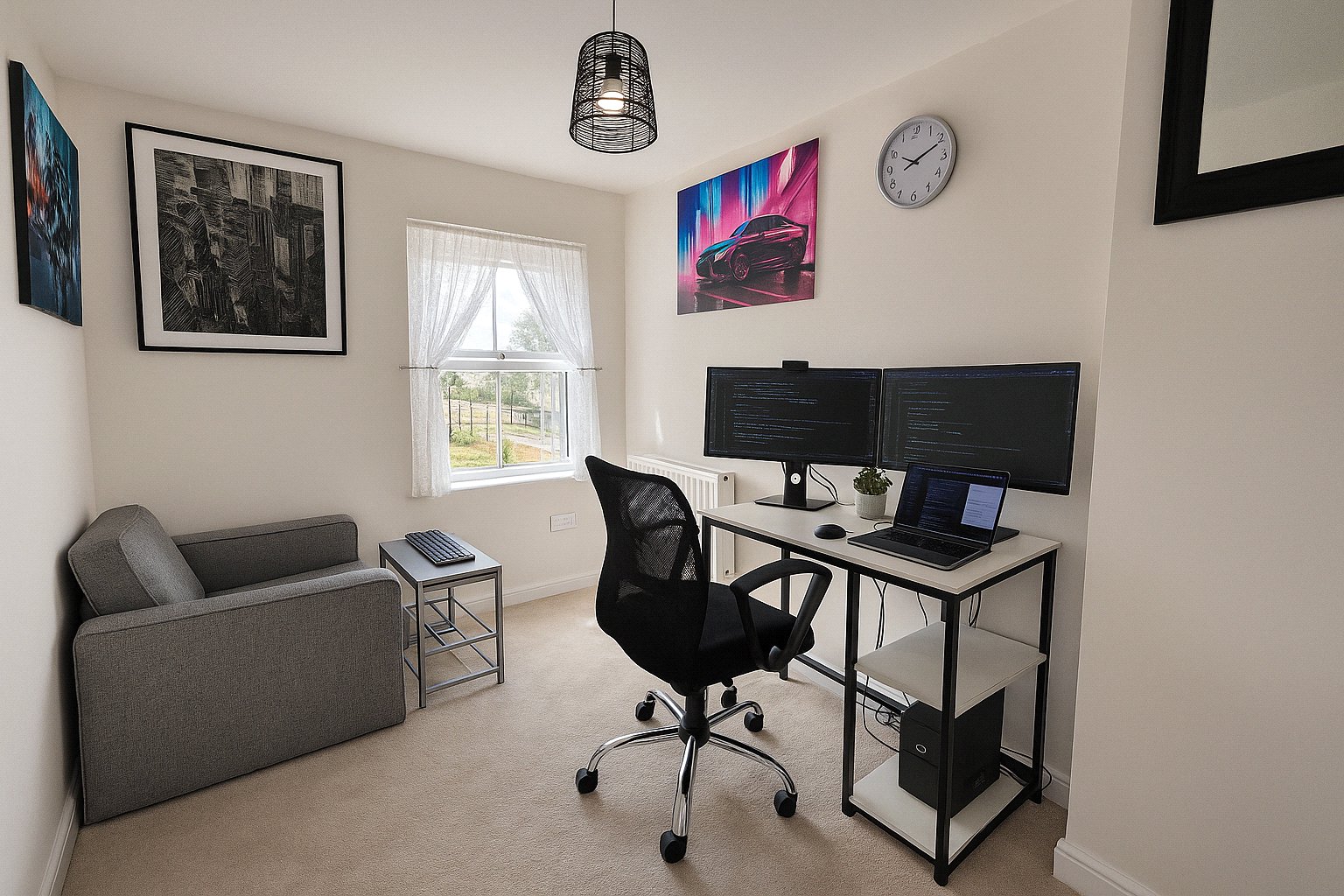 Upstairs, the spacious principal bedroom boasts private en-suite, while two further bedrooms offer flexibility for family, guests, or homeworking. A well-appointed family bathroom completes the first floor, designed with both practicality and comfort in mind.