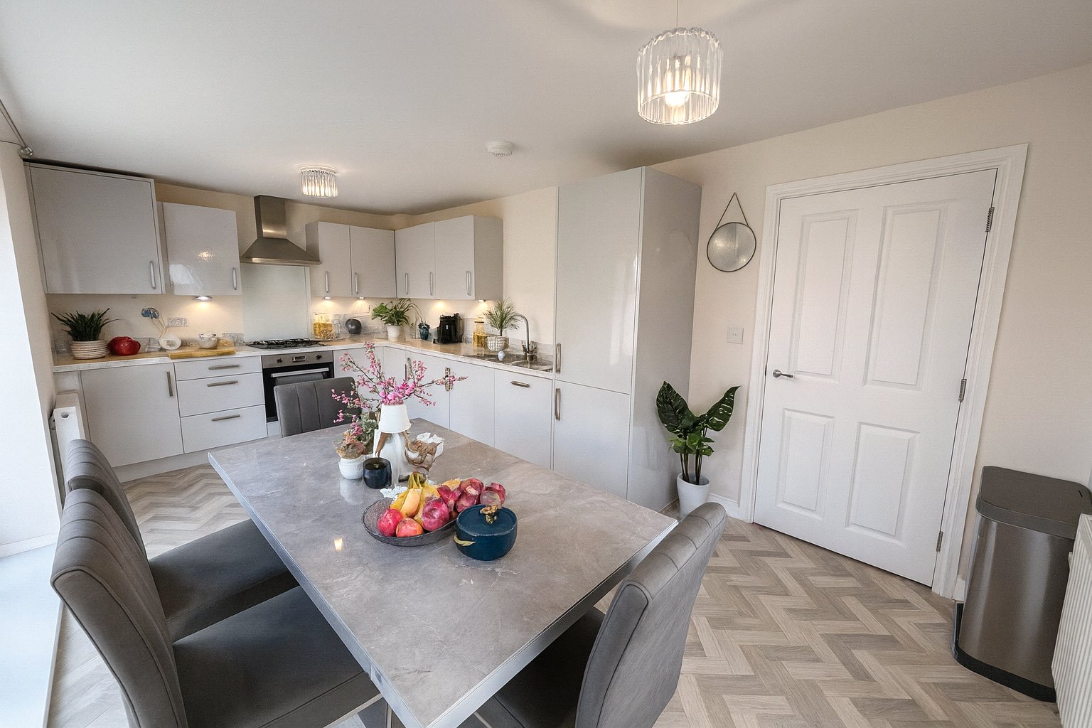The ground floor is thoughtfully arranged, featuring a bright lounge complemented by a convenient downstairs WC. To the rear, the impressive open-plan kitchen, dining, and family area creates the heart of the home. With sleek fitted cabinetry, integrated appliances, and a designated dining space, this room is perfect for both everyday living and entertaining. French doors open directly to the g...