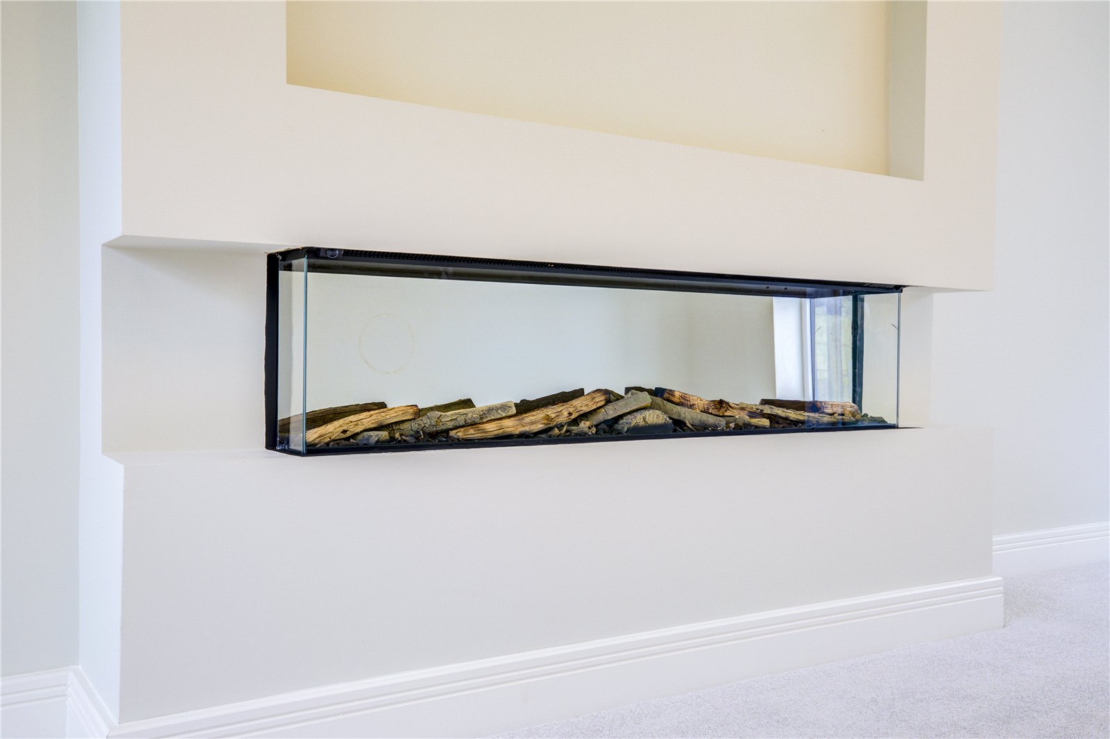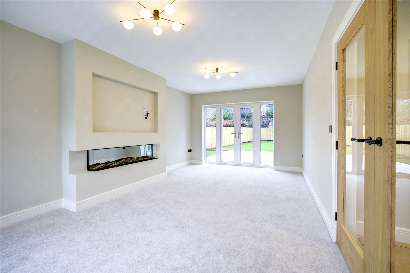 - Spacious dual-aspect living room with feature fireplace, media wall and French doors to the garden