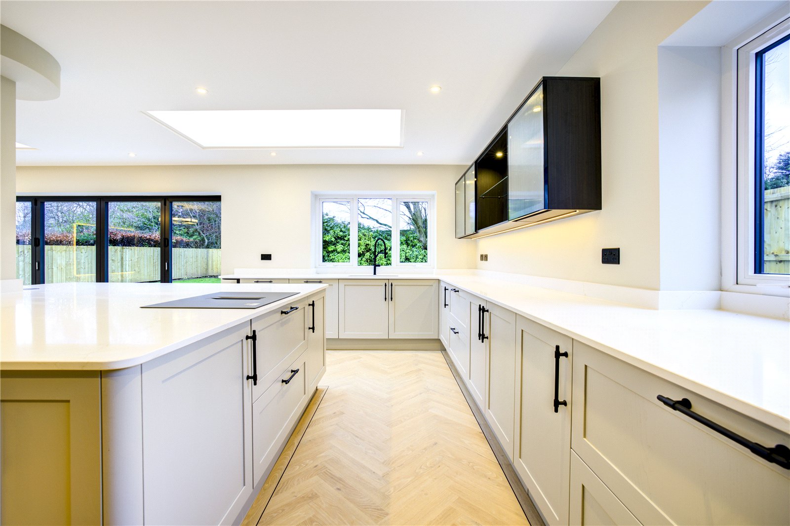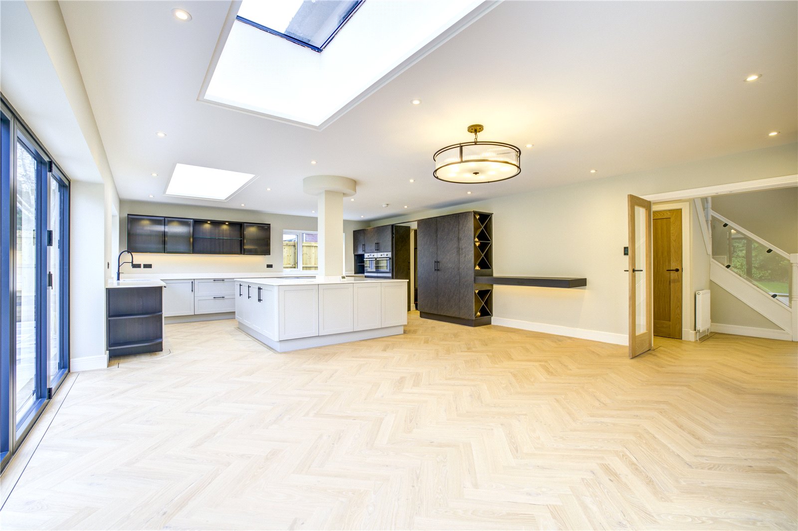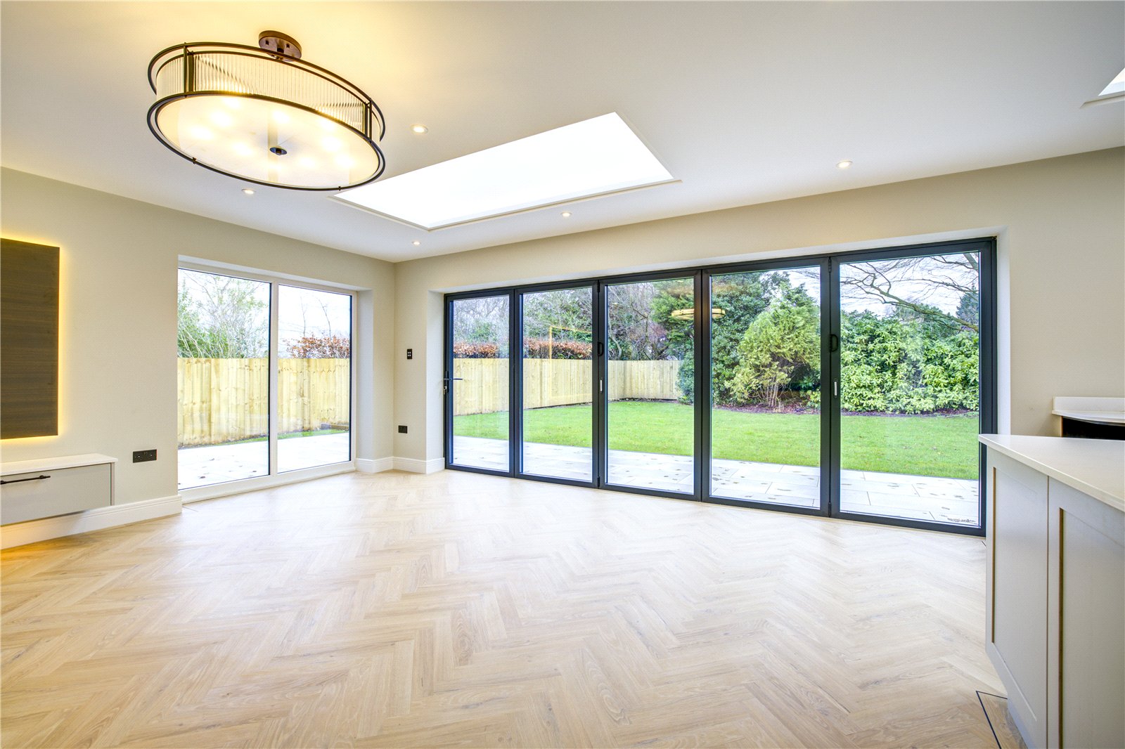 The true heart of the home is the exceptional open-plan kitchen, dining and family room – a space designed for modern living and entertaining. This stunning room boasts a comprehensive range of fitted units, luxurious quartz work surfaces and a substantial central island, complemented by high-quality AEG appliances. A striking feature lighting system, Amtico flooring throughout, an impressive media wall, and integrated fittings making the property 'sound system ready', elevate the space further. With windows to three aspects, dome skylights overhead and bi-fold doors opening onto a substantial terrace, this room is flooded with light and perfectly suited for both everyday family life and hosting guests.