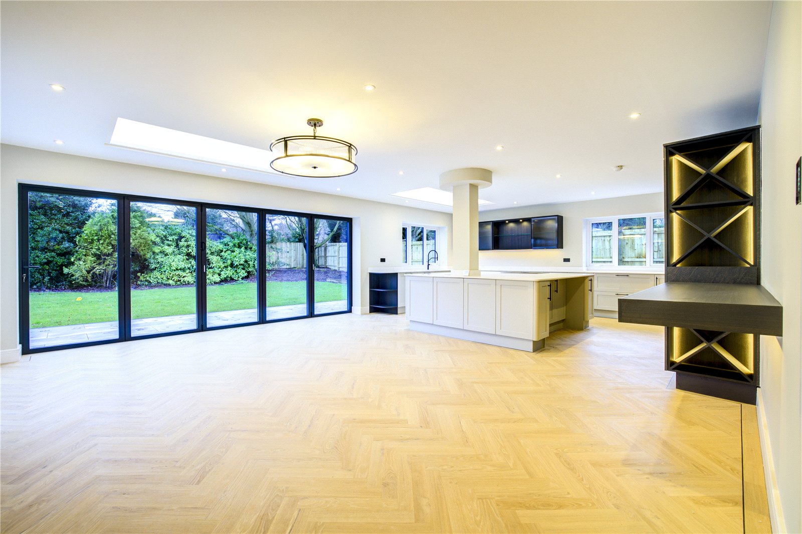 - Exceptional open-plan kitchen/dining/family room with quartz worktops, central island, AEG appliances and bi-fold doors