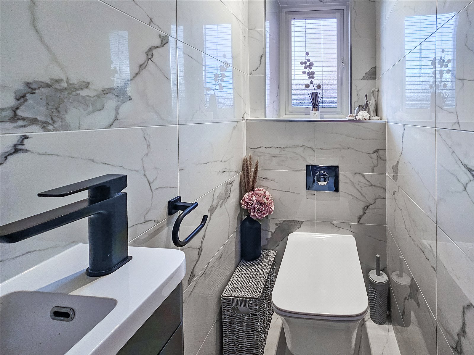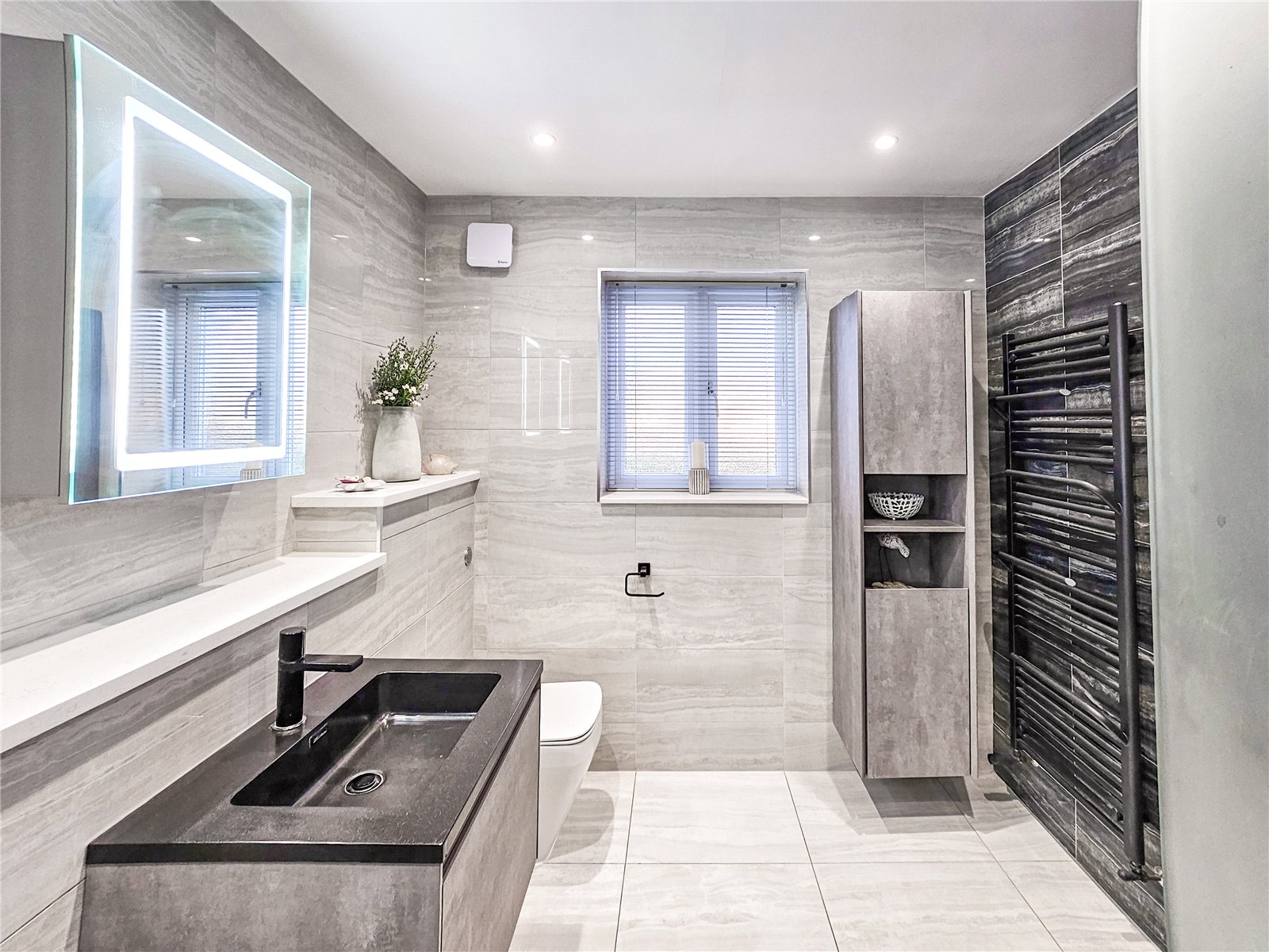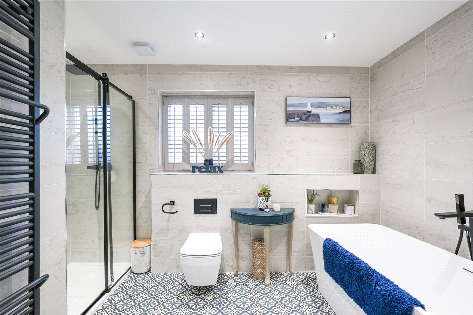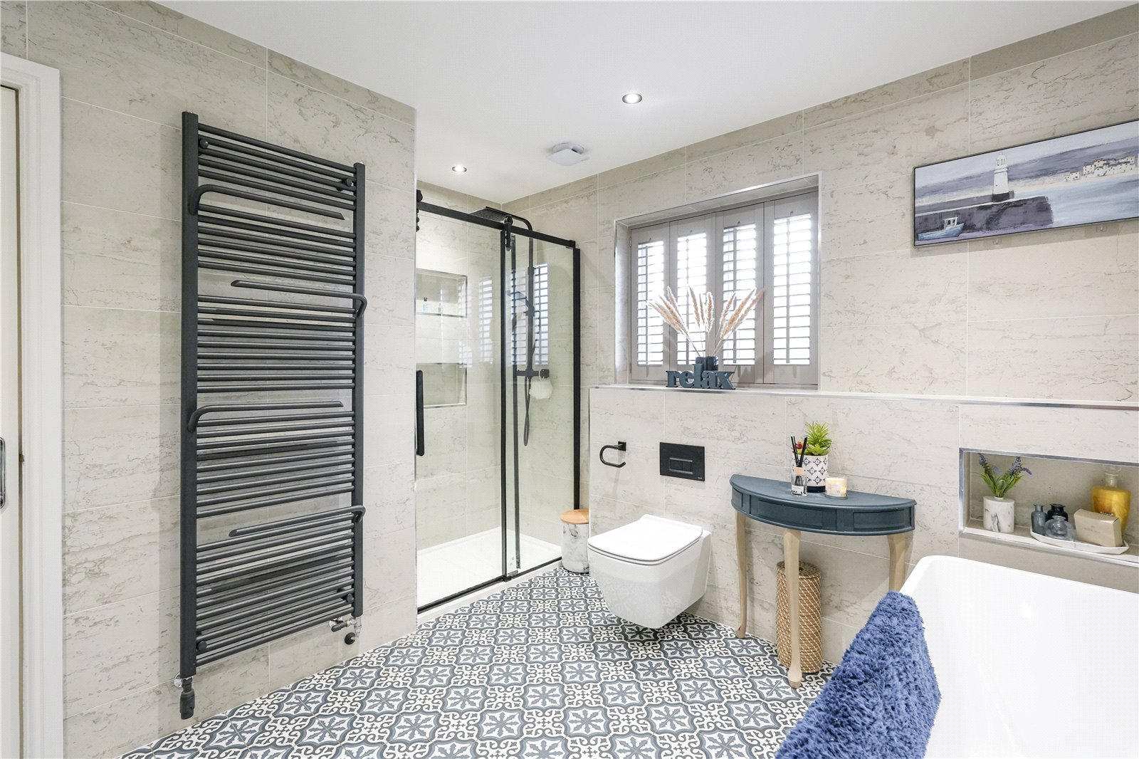 To the first floor, five beautifully presented bedrooms continue the theme of quality and thoughtful design. The principal suite provides a peaceful retreat, complete with dressing area and a luxurious en-suite shower room with a boutique hotel feel. A second bedroom also benefits from en-suite facilities, while the remaining bedrooms are served by a contemporary family bathroom featuring a freestanding bath and separate walk-in shower.