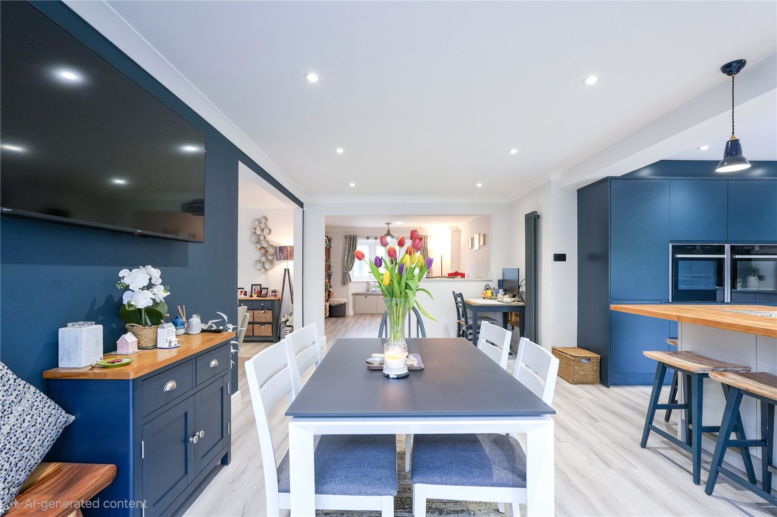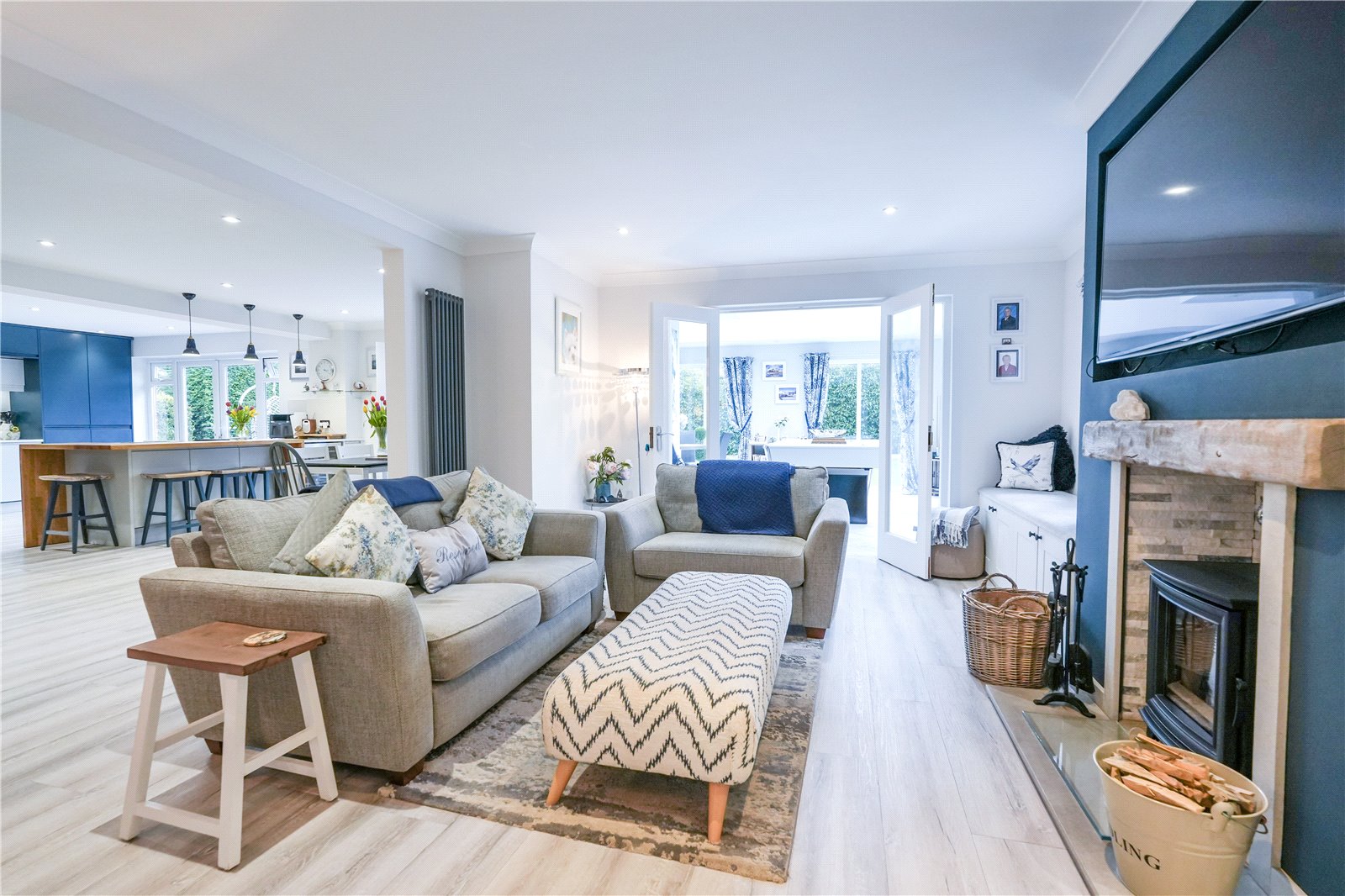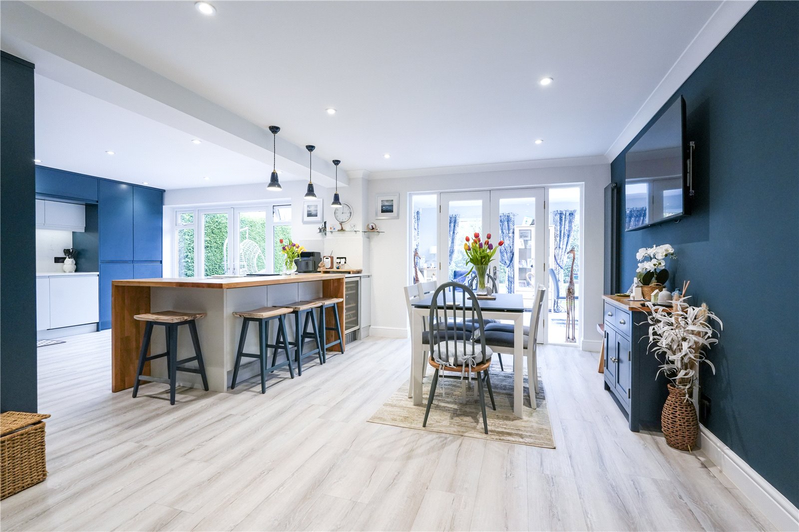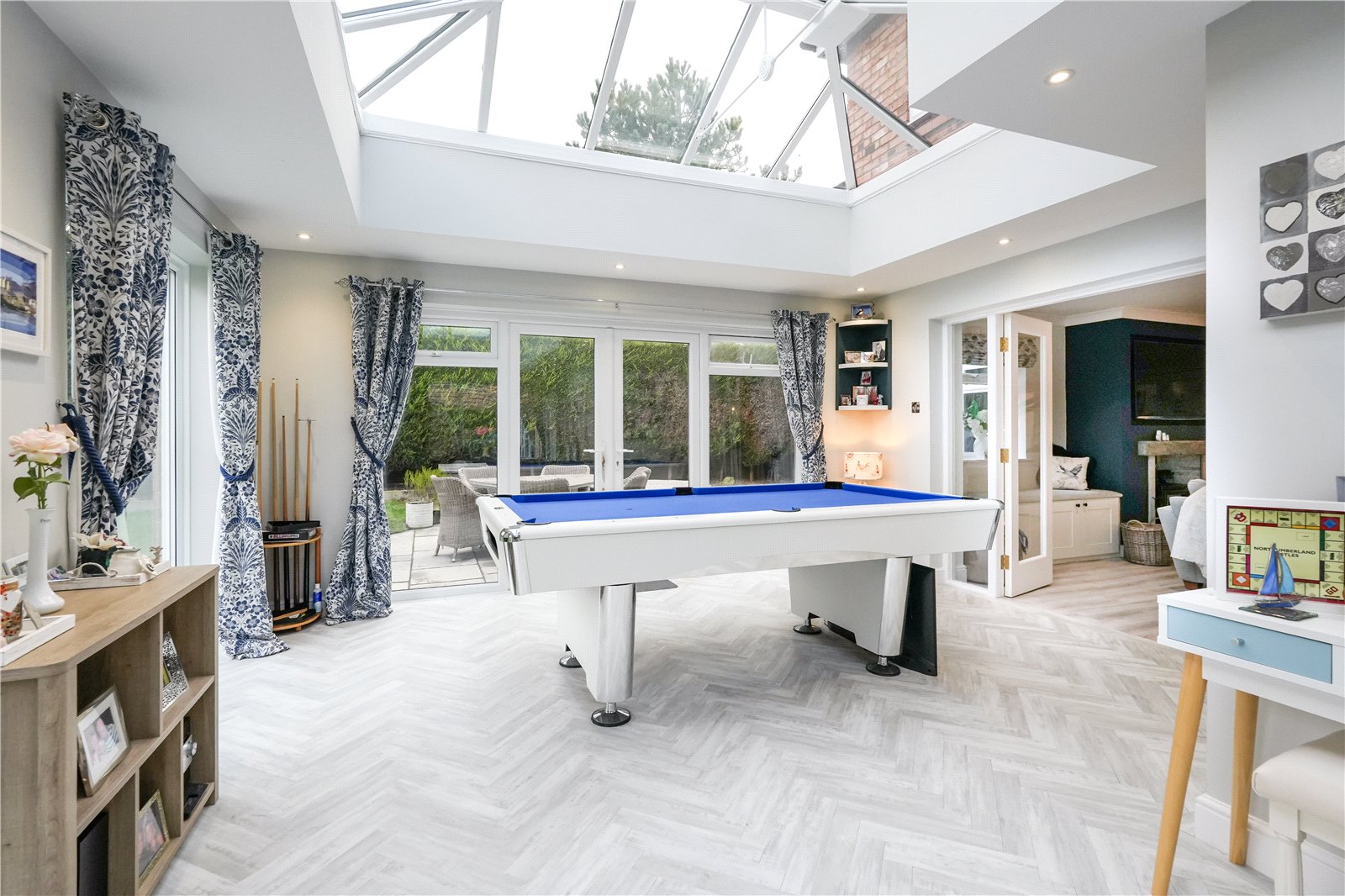 At the heart of the home lies a stunning open-plan kitchen and dining area, thoughtfully designed as a central hub for family life. Finished with sleek cabinetry, high-quality integrated appliances and a generous central island with breakfast bar, this impressive space effortlessly blends style and practicality. French doors open onto the garden terrace and adjoining orangery, creating a seamless transition between indoor and outdoor living — ideal for both everyday family life and entertaining on a larger scale.