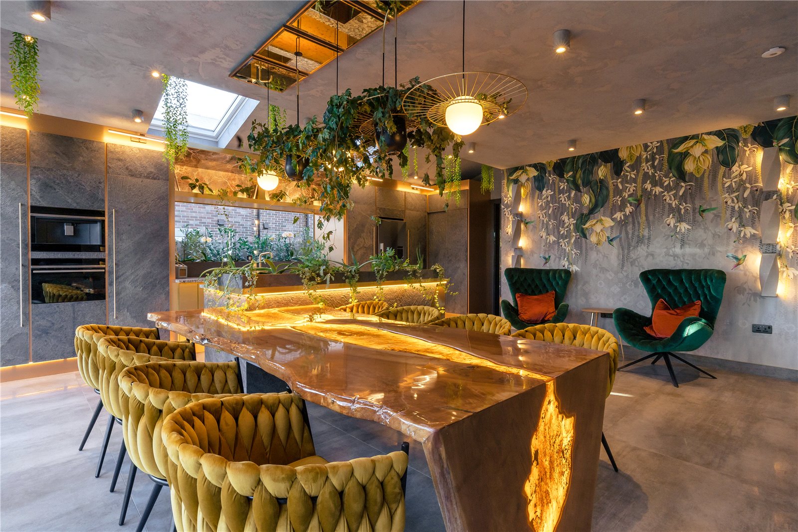 Further reception space is provided by an additional family room complete with a bespoke bar, perfectly suited for entertaining. The heart of the home lies within the stunning open plan kitchen, family and dining area, where natural stone finishes, curated artwork and exceptional detailing create a truly statement space. At its centre sits an exquisite, handcrafted feature kitchen table complemented by bespoke feature lighting, forming a dramatic yet functional focal point for both dining and entertaining. High-quality cabinetry and sleek finishes combine with an excellent sense of light and space, while bi-folding doors open directly onto a covered terrace, seamlessly blending indoor and outdoor living and providing an ideal setting for year-round dining and socialising. A discreet back kitchen enhances practicality, while a ground floor WC and a separate utility room further add to the home’s thoughtful layout.